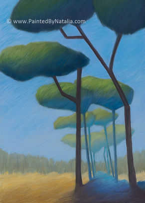 This work unfolds in a range of cool blues and soft lavender. Cypress trees stand like quiet sentinels in a gently layered landscape. The perspective leads the eye through the image in flowing waves—each tree a soft echo of the one before.