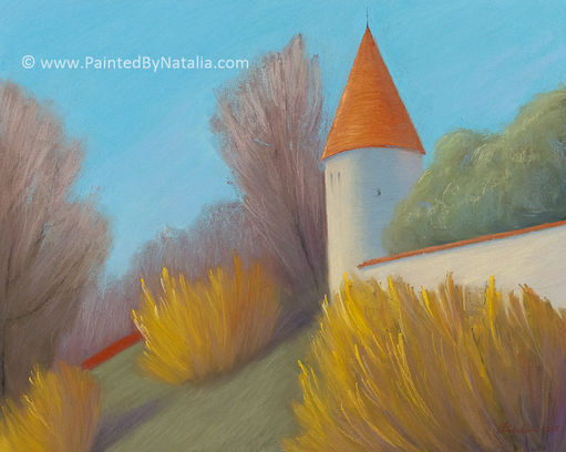 This work captures the early stirrings of spring in Neuburg an der Donau — a quiet moment filled with warmth and clarity. A historic tower with its red-tiled roof rises gently behind a sloping garden, where golden shrubs begin to glow in the first strong light of the season.
